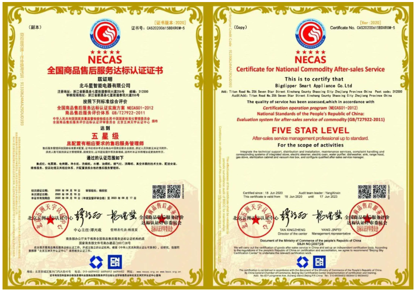2020年6月,歷經(jīng)嚴(yán)格審核,北斗星集成灶從眾多品牌中脫穎而出,榮獲售后服務(wù)認(rèn)證中的“五星級(jí)售后服務(wù)認(rèn)證”和“七星級(jí)(卓越)售后服務(wù)體系認(rèn)證”雙認(rèn)證。這意味著北斗星售后服務(wù)質(zhì)量達(dá)到了國(guó)家最高標(biāo)準(zhǔn),樹(shù)立行業(yè)服務(wù)標(biāo)桿!